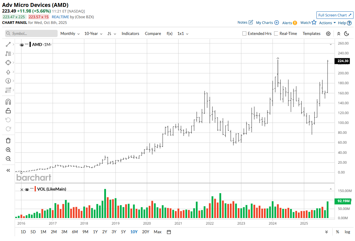 AMD (AMD) stock surged nearly 24% on Monday after the company announced a partnership with OpenAI, which could give the ChatGPT maker a 10% stake in the semiconductor giant. OpenAI will deploy six gigawatts of AMD's Instinct graphics processing units (GPUs) over several years, starting with a 1-gigawatt rollout in late 2026.