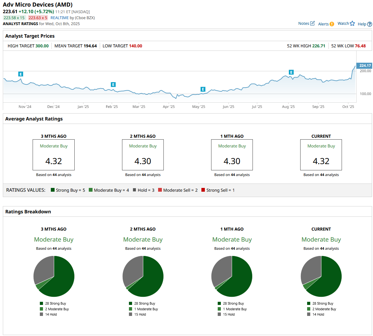 Out of 44 analysts covering AMD stock, 28 recommend “Strong Buy,” two recommend “Moderate Buy,” and 14 recommend “Hold.” The average AMD stock price target is $194.64, below the current target price of $223. However, the high target of $300 set by Barclay's gives the stock a good 35% left to run.
